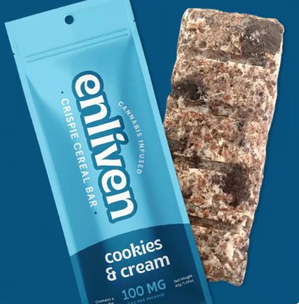 Enliven is proud to now offer Cookies & Cream Cereal bars! Made with crispy chocolate cereal, ooey-gooey marshmallow, and loaded with Oreo cookie pieces, this bar is a treat that chocolate lovers adore. Each bar contains 100 mg THC, sourced from the highest grade hybrid distillate, extracted with CO2 for a long lasting, full entourage effect. The bars are sectioned into five pieces for easy dosing.