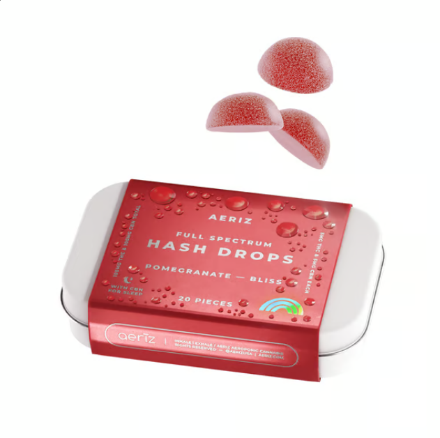 Aeriz Hash Drops in Pomegranate White Peach Gelato are full-spectrum hash oil (FSHO) edibles designed for relaxation, often featuring a 1:1 ratio of 100mg THC to 100mg CBN per 20-pack. These indica-leaning, fruit-forward gummies are vegan and gluten-free, aiming to provide a calming, "full-bodied" high through the entourage effect.