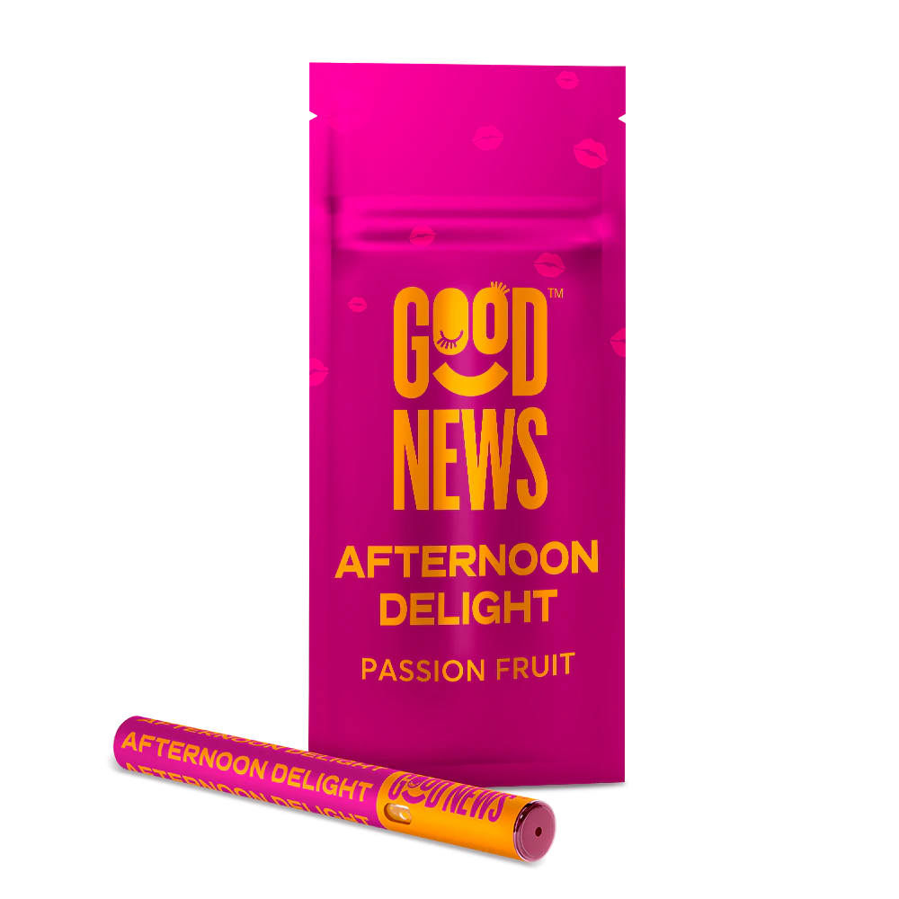 Good News "Afternoon Delight" is a passion fruit-flavored,, often sativa-dominant, disposable vape designed for intimate, social, or relaxing moments. Known for a sweet, fruity, and slightly pungent flavor, it offers a quick-acting, uplifting, and sociable buzz, making it popular for enhancing moods and intimate occasions.
