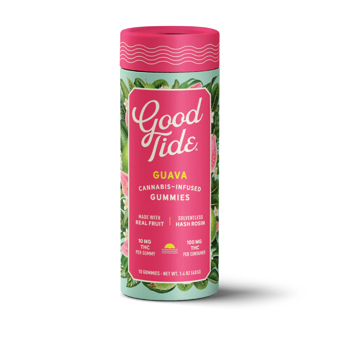ABOUT Take a tropical plunge with Good Tide Guava gummies. Infused with rosin extracted from hybrid cannabis strains, our guava gummies offer a balanced high with true-to-plant properties. The naturally occurring terpenes and minor cannabinoids present in our solventless hash rosin combine with the real-fruit guava ingredients to create a deliciously rounded experience. Dive in- the vacation has already begun.