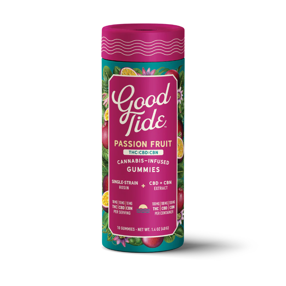 Take your mellow to the next level with Good Tide Passion Fruit THC:CBD:CBN gummies. An Indica single-strain rosin is enhanced with an extra dose of CBN and CBDโs relaxing properties and the tropical delight of passion fruit flavor to help you sway into the perfect hammock nap.โ10mg THC:CBD:CBN per gummy, 100mg THC:CBD:CBN per package. Made with fully compostable packaging.