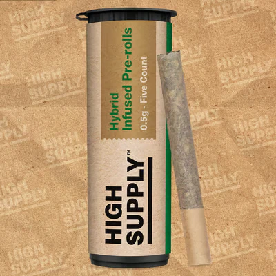 Infused Pre-Rolls from High Supply marries potency and portability, at a sweet price. Five 0.5g Pre-Rolls per package, at a 70:30 blend of lab-tested flower and sand of the same dominance. Each joint’s a one-way trip to a good time. Burn responsibly.