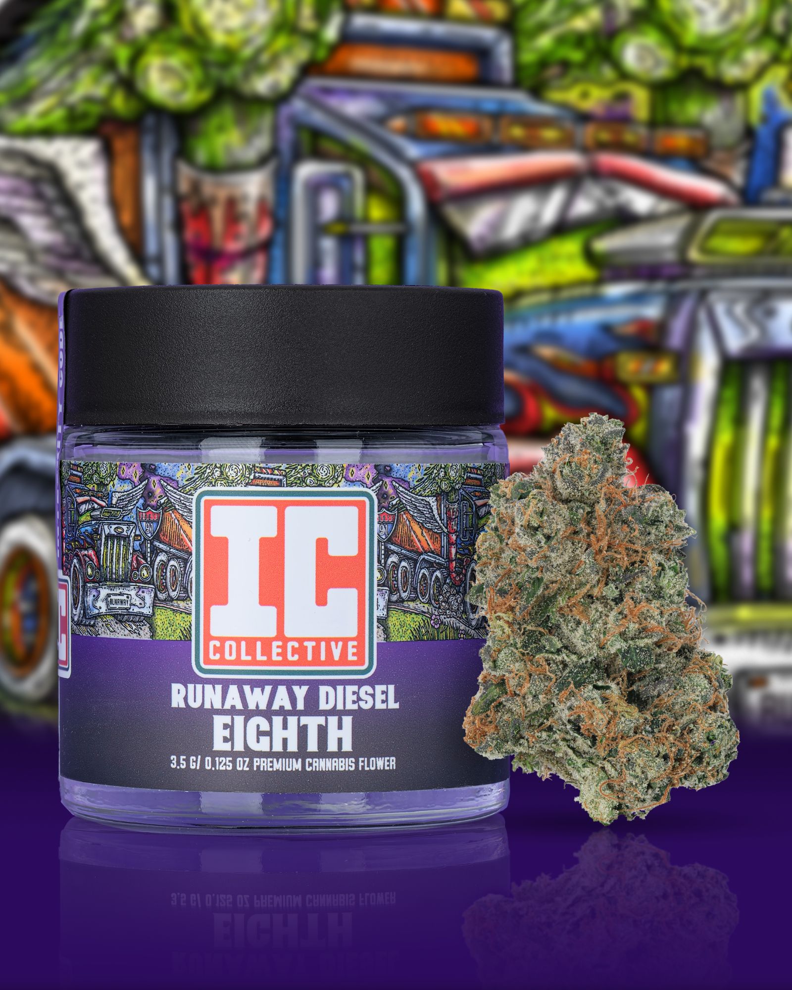 Genetics: One Way x Sour Diesel An out-of-body high hits heavy with this IC Collective original. We keep this cultivar in the rotation because of her in- tense look & cerebral effects. We gave it the name “Runaway” because this banger has a dose of classic Sour Diesel high energy and gasoline smell. We culled through six phenos to find the best cultivar —and this one definitely runs on fuel.