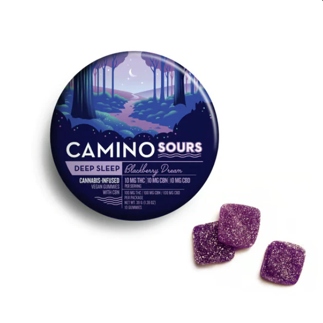 10mg THC, 10mg CBD, & 10mg CBN per piece | 100mg THC, 100mg CBD, & 100mg CBN total in 10 pieces -- EFFECT: Sleep (Indica) -- Drift into dreamland by way of a whimsical woodland forest filled with fragrant blackberry bushes. Blackberry Dream Camino Sours combine an indica-like blend of THC, CBD, and CBN with chamomile and lavender extracts for a tranquil effect enhanced by soothing terpenes. Take one of these subtly sour gummies and call it a night. -- There’s a Camino for every taste, tolerance, and occasion. With a variety of terpene-tailored effects and delicious fruit flavors, we invite you to explore our family of Camino edibles. We know you’ll… find your sweet spot. -- INGREDIENTS: Tapioca Syrup, Sugar, Water, Pectin, Natural Flavors, Malic Acid, Citric Acid, Sodium Citrate, Sodium Malate, Chamomile Extract, Lavender Extract, Cannabis Extract, CBN Isolate, Fruit & Vegetable Juice for Color, Coconut Oil, Carnauba Wax, Terpenes. -- Camino by KIVA